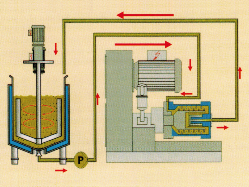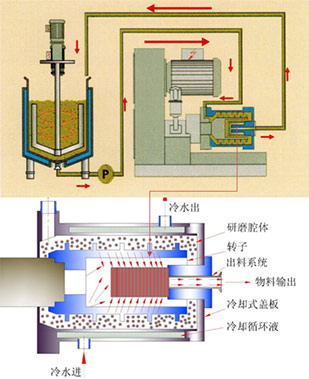 可实现低温砂磨 缩短浆料在磨腔内的滞留时间,有效抑制温度上升。通过循环冷却水的冷却,可实现低温砂磨。 |